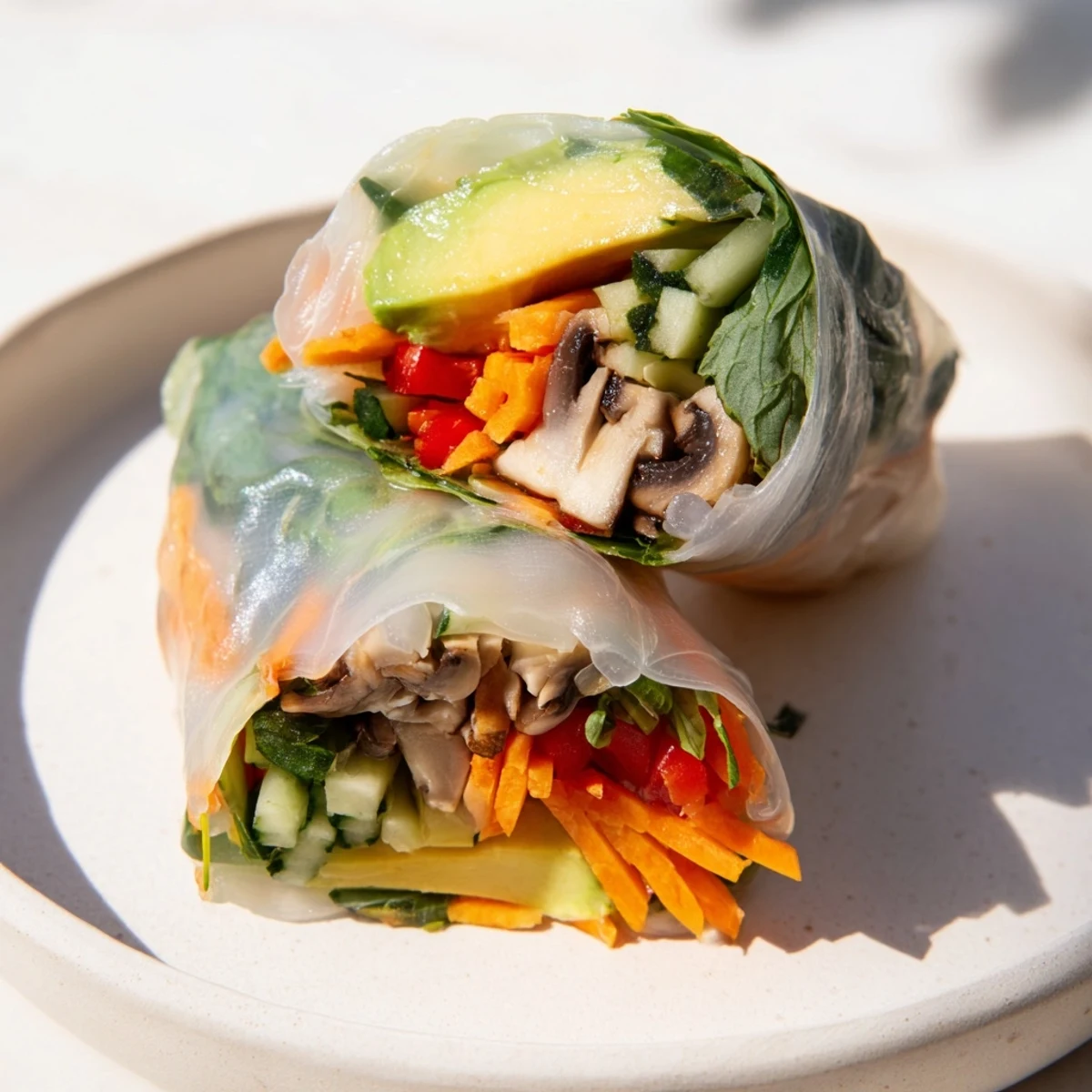 Create these fresh, vibrant spring rolls featuring creamy avocado, sautéed shiitake mushrooms, and crisp vegetables wrapped in delicate rice paper. Perfect for light appetizers or healthy snacks, these rolls come together in just 35 minutes with simple preparation techniques.