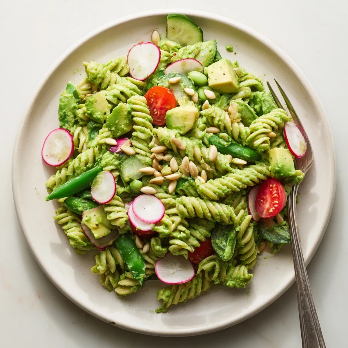 - In your biggest mixing bowl toss together the cooled pasta snap peas cucumber tomatoes radishes spinach and scallions. Pour that beautiful dressing over the top and use a gentle folding motion so you do not crush the tomatoes or mash the avocado.