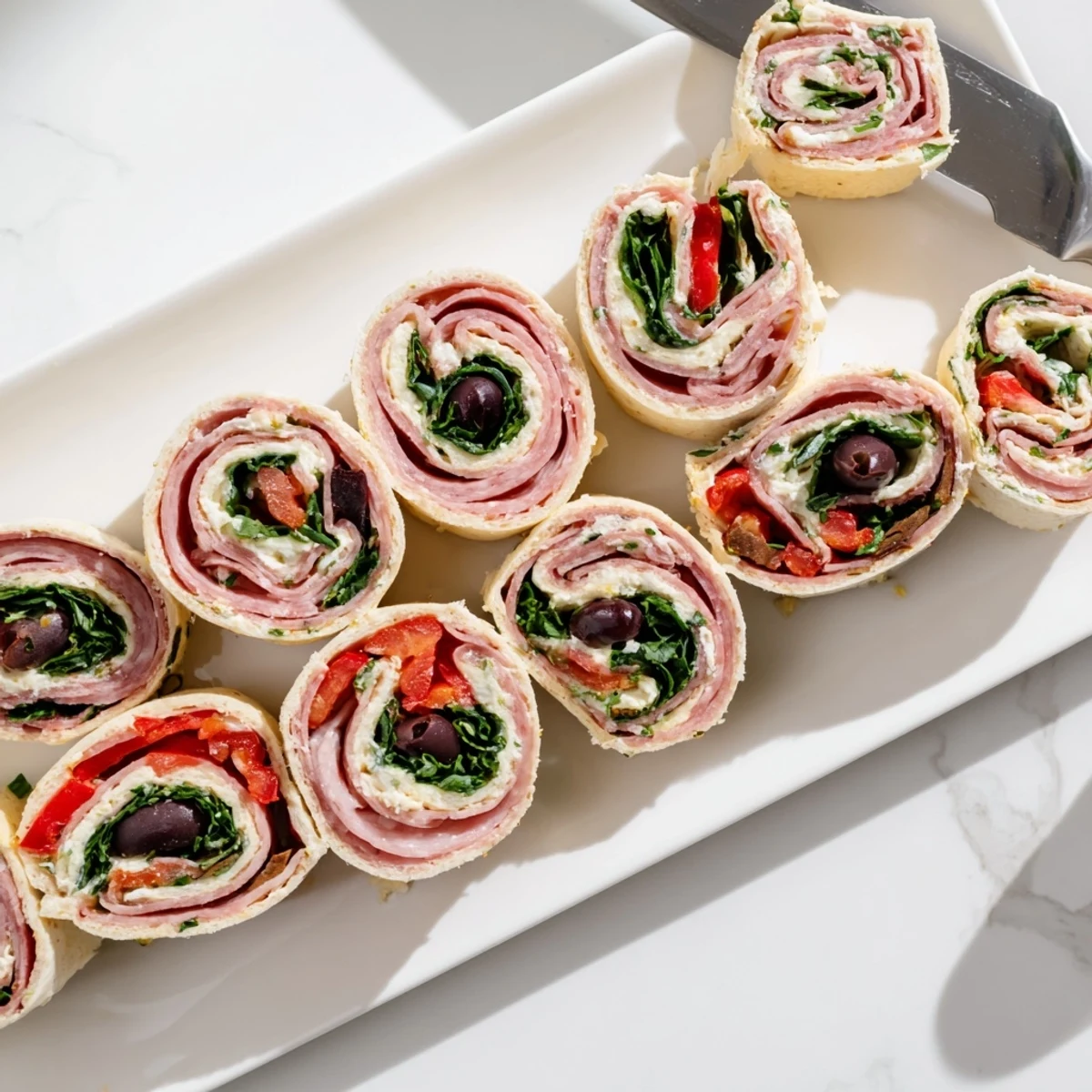 These colorful pinwheel sandwiches combine classic Italian flavors in a convenient handheld format. Thinly sliced Genoa salami, pepperoni, and deli ham layer with provolone cheese, baby spinach, roasted red peppers, and black olives inside soft flour tortillas. A creamy spread of cream cheese, mayonnaise, Italian seasoning, and garlic powder ties everything together. Simply assemble the layers, roll tightly, chill to firm up, then slice into bite-sized rounds. They're ideal for parties, game days, or quick afternoon snacks.