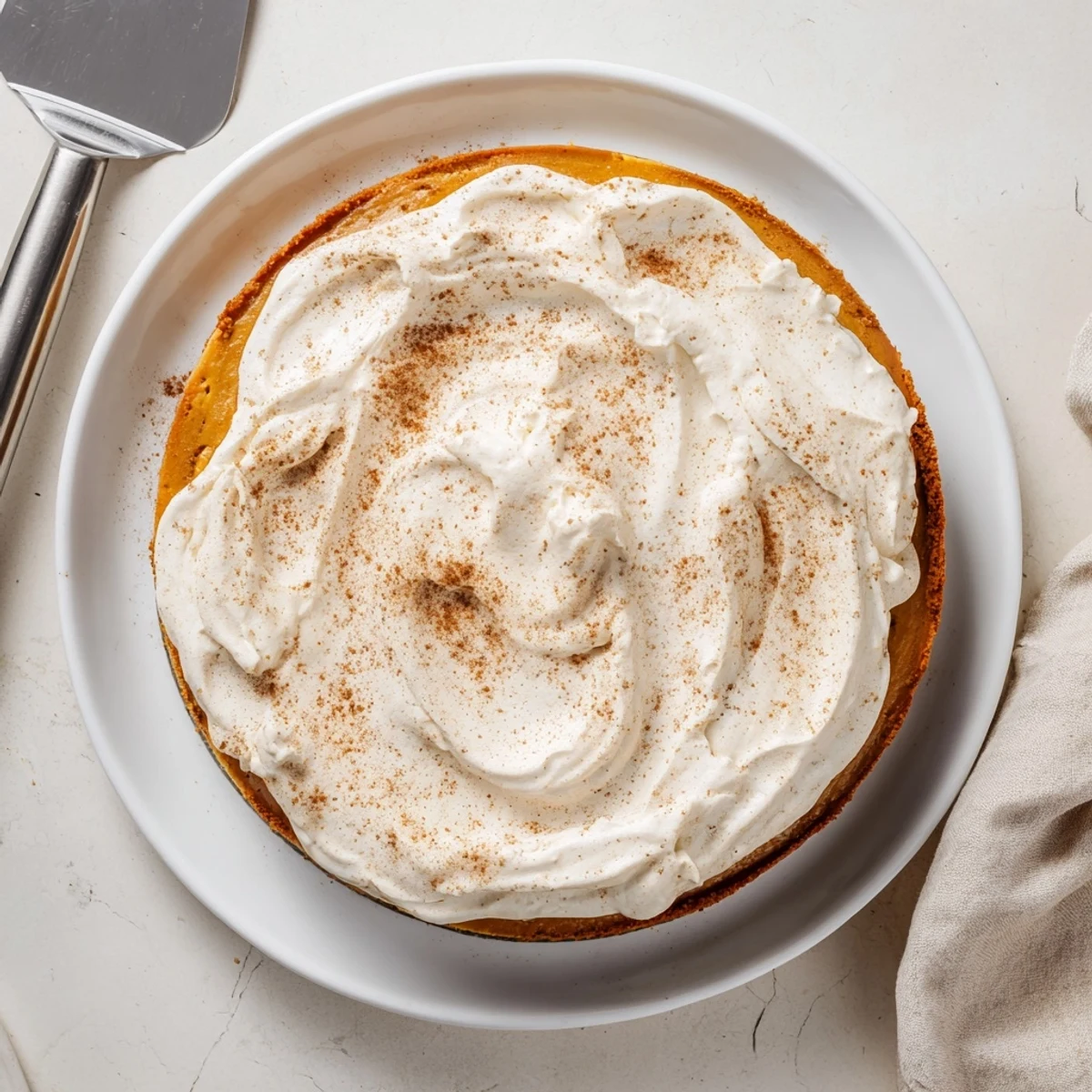 - Spread or pipe whipped cream over the chilled cheesecake and dust with cinnamon if you like.