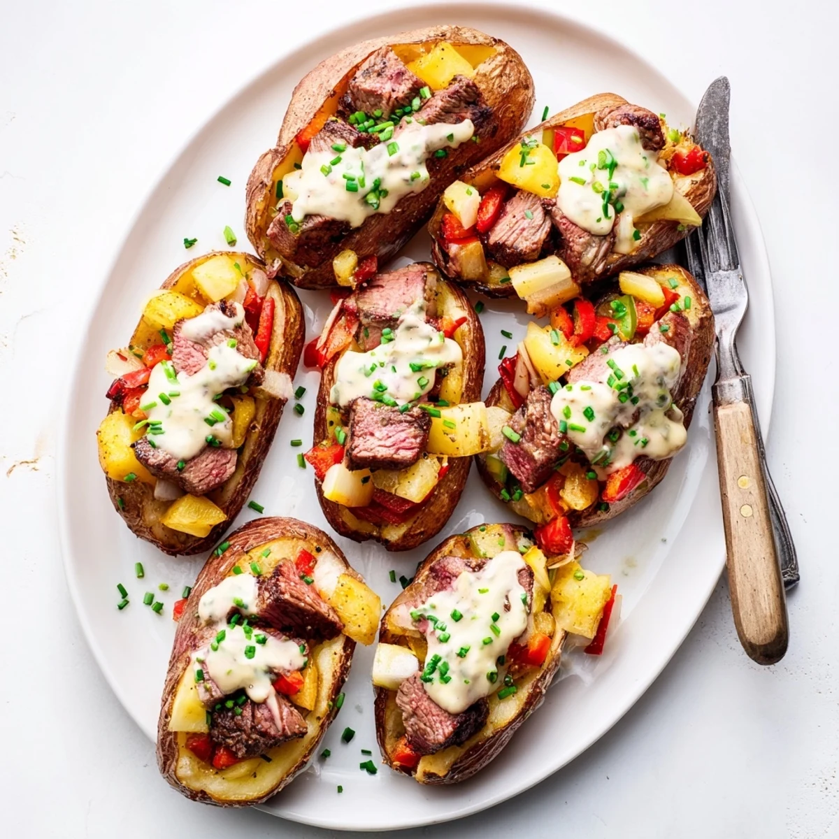 These tender baked potatoes are filled with juicy steak cubes, sautéed onions, red bell peppers, and garlic, then topped with a velvety Parmesan cream sauce. The russet potatoes are baked until perfectly fluffy, creating the ideal vessel for the savory steak filling. Each potato is generously drizzled with the homemade white sauce infused with freshly grated Parmesan, nutmeg, and cream. Ready in just over an hour, this dish makes an impressive centerpiece for Sunday dinner or a special weeknight treat.