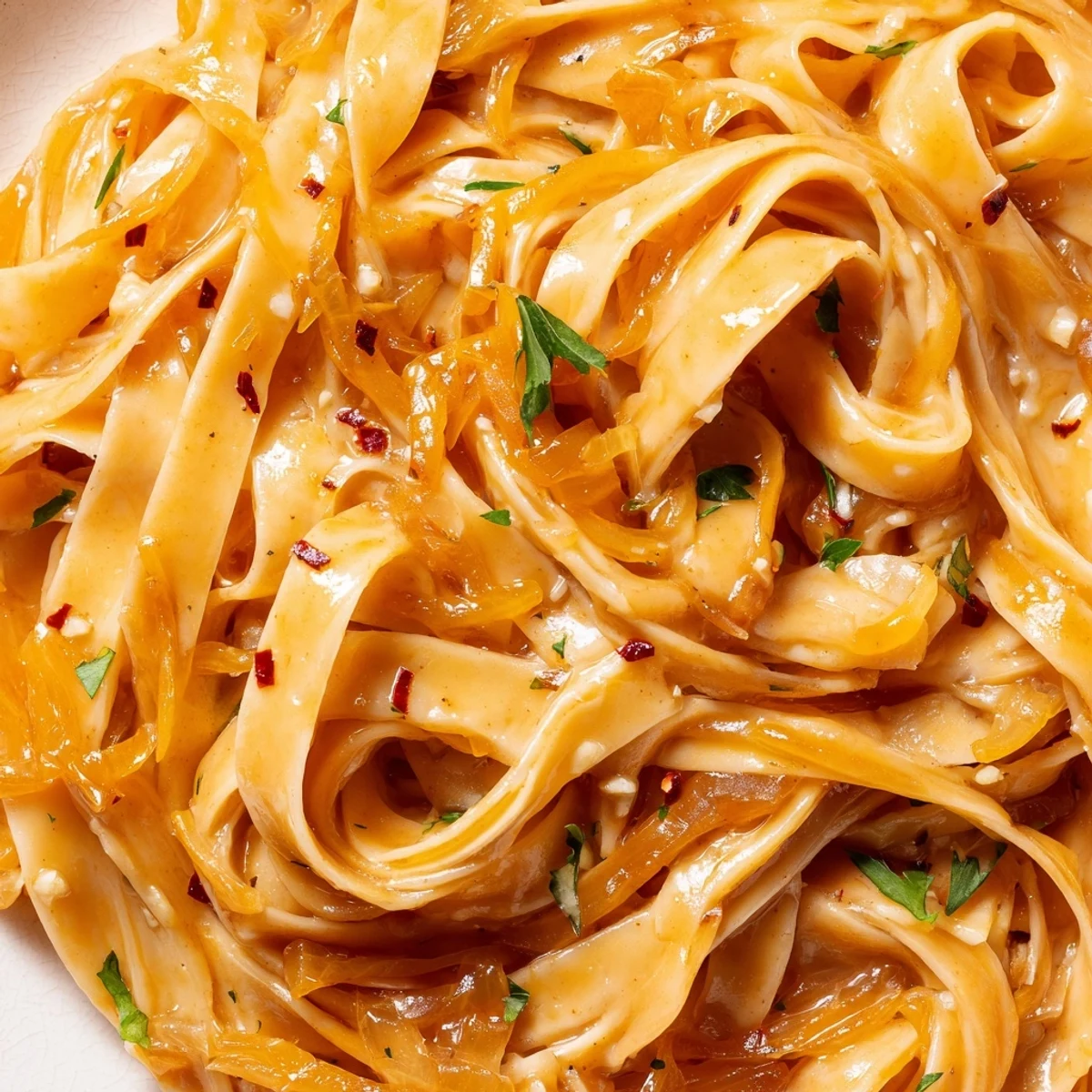 Indulge in a luxurious Italian-American pasta dish that masterfully balances sweet and spicy flavors. Tender fettuccine gets coated in a rich, creamy sauce featuring deeply caramelized onions cooked to golden perfection with brown sugar. The addition of fresh garlic, red chili pepper, and honey creates a delightful sweet heat profile that elevates this comforting main course. Ready in under an hour, this vegetarian dish serves four and offers endless customization options from protein additions to vegan adaptations.