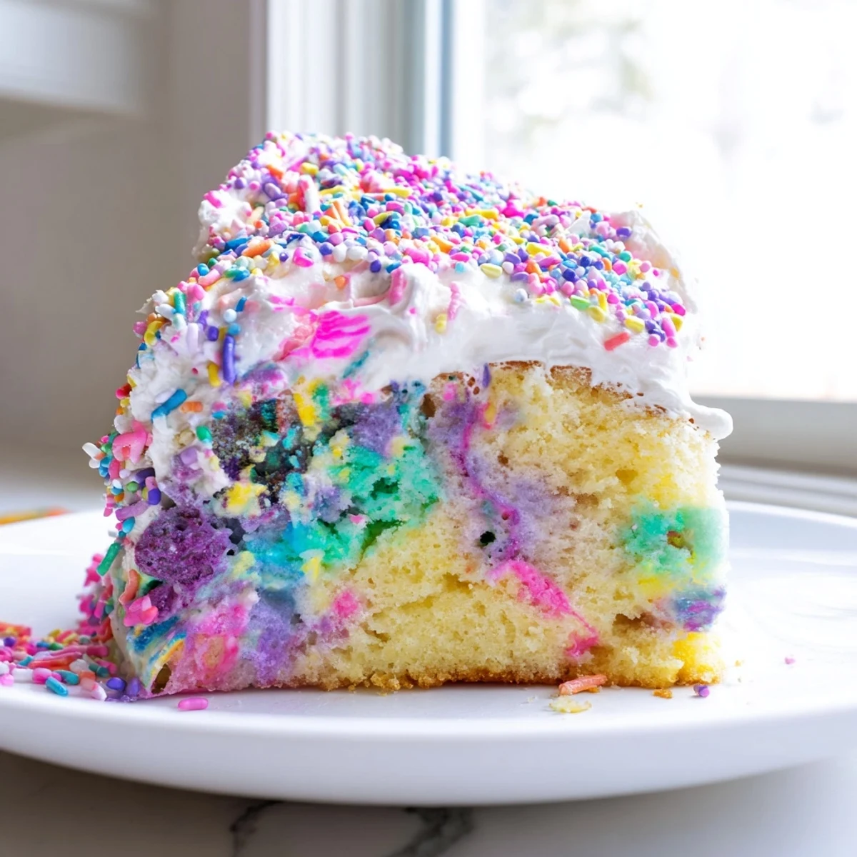 This whimsical dessert transforms a simple confetti cake into something magical. After baking, the warm cake gets dotted with holes that are filled with vibrant colored vanilla pudding in pink, purple, blue, and yellow. A cloud of whipped topping seals in all that colorful goodness, while playful unicorn sprinkles add the final festive touch. The result is a stunning rainbow slice that tastes as delightful as it looks—moist, creamy, and perfectly sweet. Chill for at least an hour to let the pudding set into the cake for the best texture.